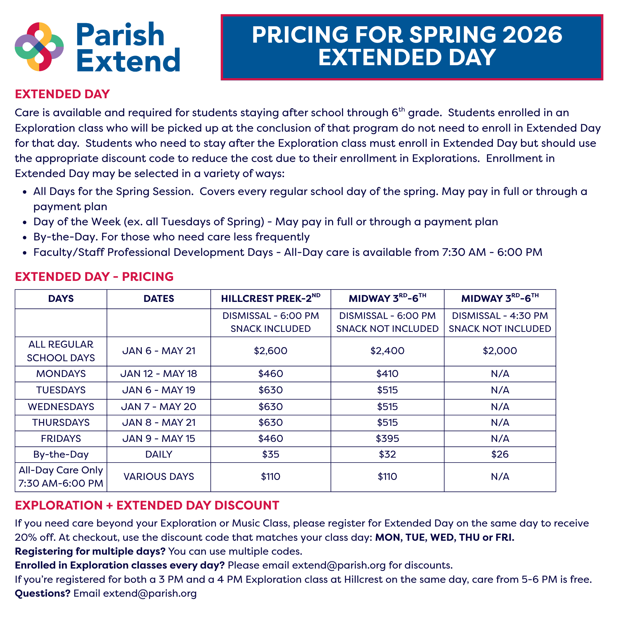 Please email Extend@Parish.org with future schedule changes. If you have a same-day carpool change, please email before 2:00 p.m.